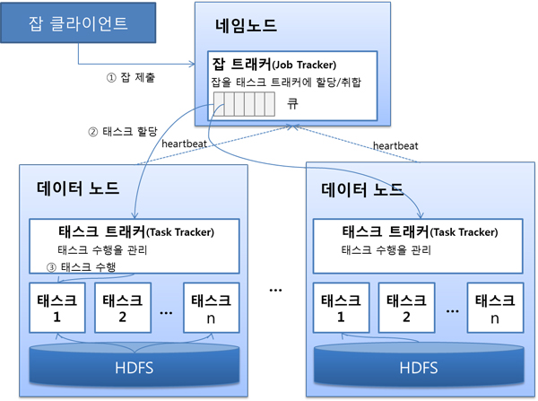 맵리듀스 잡의 실행 단계(클라이언트 JVM ->잡트래커/태스크트래커)는 생략했습니다.